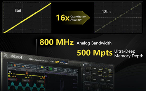 The MHO900 series is RIGOL’s newly launched economical oscilloscope. Compact in size, it features 1,000,000 wfms/s capture rate, max. memory depth of 500 Mpts (optional), 12-bit high resolution and low noise.